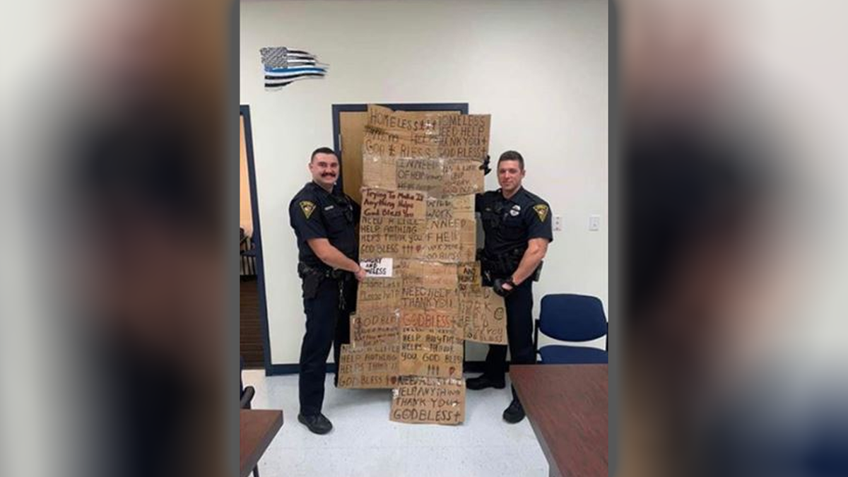 The taped together cardboard signs have several different messages written on them including: "Hungry and Homeless," "Homeless Need Help Thank you + God Bless"